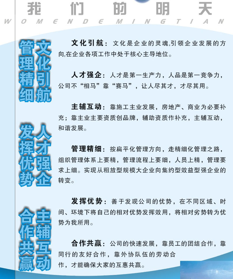 4、企業(yè)文化是企業(yè)發(fā)展戰(zhàn)略規(guī)劃的重要組成部分,公司的發(fā)展戰(zhàn)略是:文化引航、人力強(qiáng)企、主輔互動(dòng)、精細(xì)管理、發(fā)揮優(yōu)勢、合作共贏。