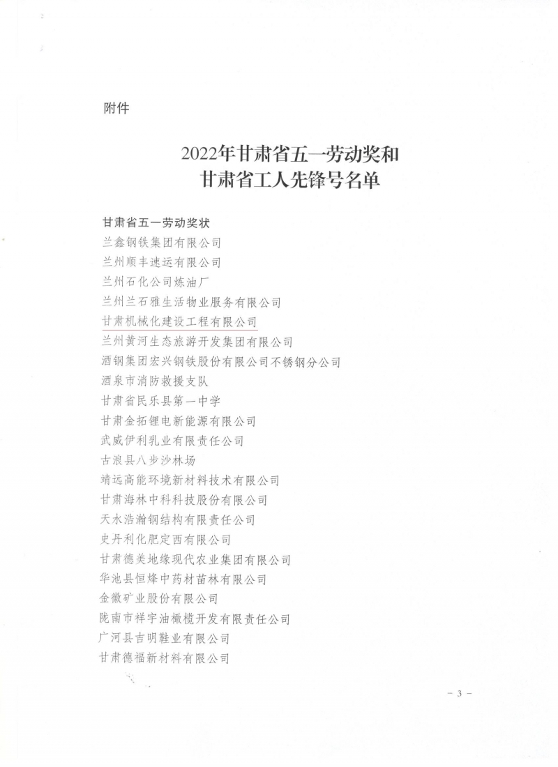 近日,甘肅省總工會發布了《關于表彰2022年甘肅省五一勞動獎和甘肅省工人先鋒號的決定》,我司被授予“甘肅省五一勞動獎”和“甘肅省工人先鋒號”。